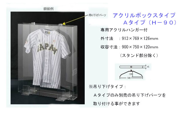 > 商品内容 ■ユニフォーム額 アクリルボックスタイプ 専用アクリルハンガー付 ■サイズ 外寸法 :913×769×126mm 収容寸法:900×750×120mm (スタンド部分除く)) ※吊り下げタイプ: Aタイプのみ別売りの吊り下げ パーツを取り付ける事ができます。