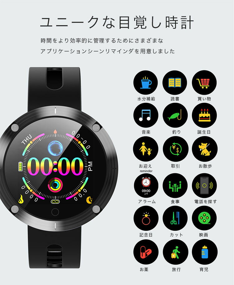 時計表示、心拍数測定、血圧測定、睡眠時間測定、スポーツモード(歩数・消費カロリー・走行距離)、生理管理機能、長座注意喚起、着信通知、SNS通知、リモートカメラ、カウントダウン、ストップウォッチ、Android4.4/iOS 9.0以上のスマートフォンに適応しています。